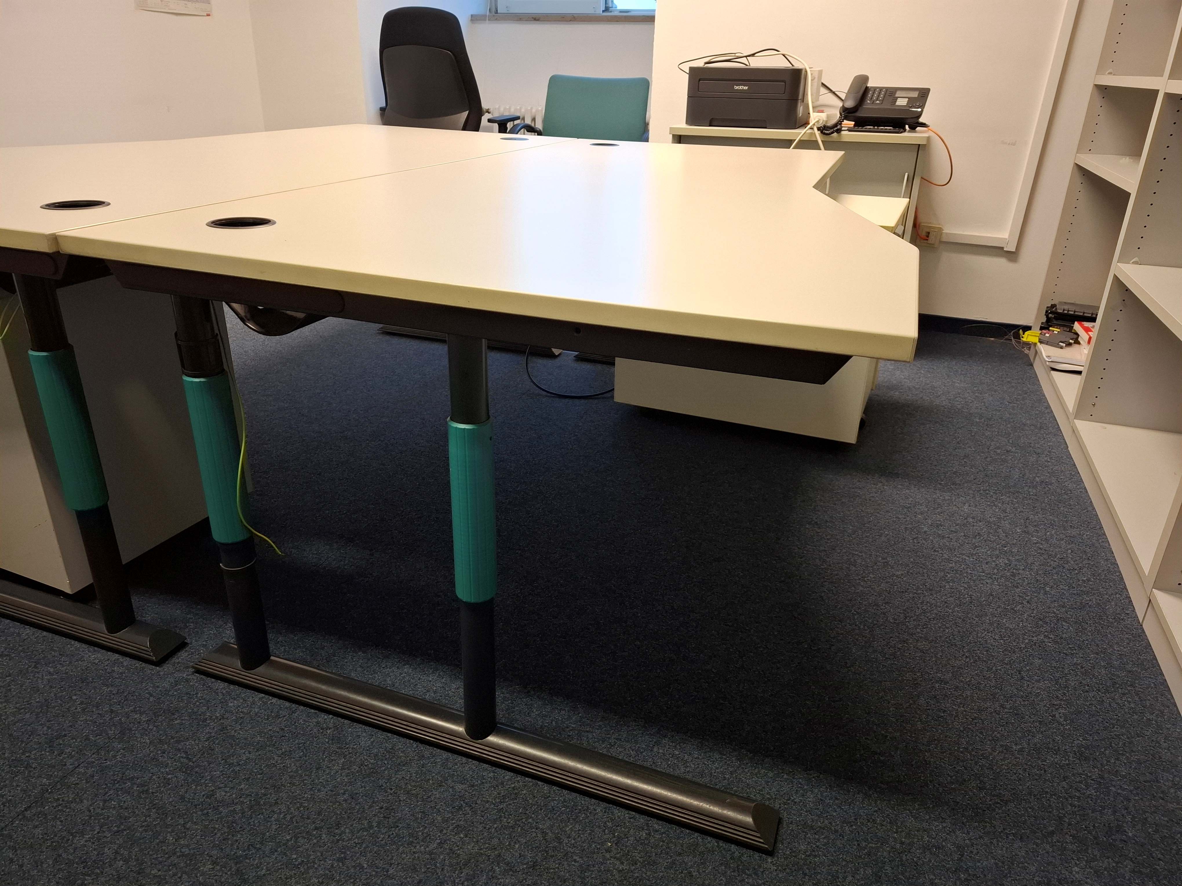chreibtisch mit weißer Platte und schwarzem Gestell, höhenverstellbar, Platte rechts mit Ecke, Maße 180*80/100 cm. Mit Kabelkanal. Leichte Gebrauchsspuren